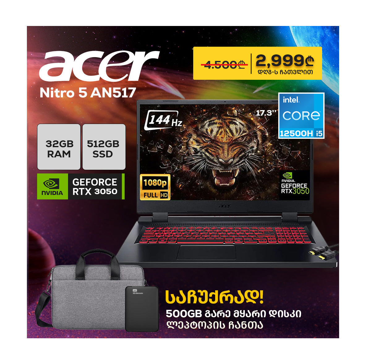 ლეპტოპი თამაშებისთვის (Gaming) Acer Nitro 5 AN517 17.3 FHD (i5-12500H/32GB/512GB SSD/RTX 3050) - AN517-55-5354