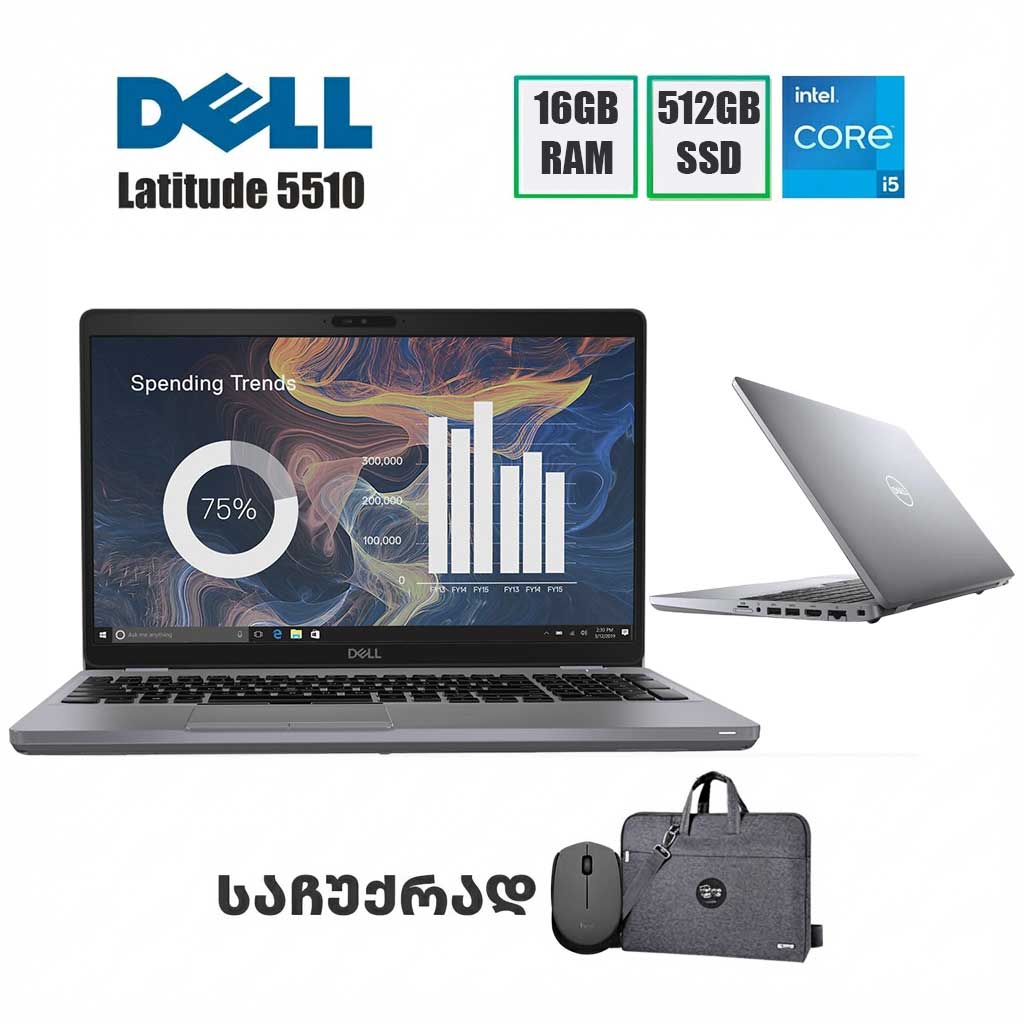 DELL-ის ძლიერი სამუშაო ლეპტოპი Latitude 5510 განსაკუთრებული მონაცემებით! 15.6" IPS FHD ეკრანი, 4 ბირთვიანი/8 არხიანი მე-10 თაობის i5 პროცესორით (i5-10210U), 16GB  DDR4 მეხსიერებით და ახალი 512GB M.2 NVME მყარი დისკით. ლეპტოპს მოყვება ლიცენზირებული Windows 11 Pro.