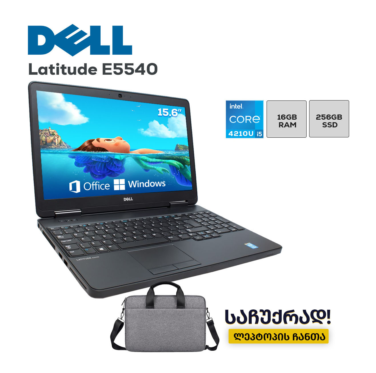 ძლიერი, სამუშაო, 15.6"-იანი ლეპტოპი Dell Latitude E5540 (მე-4 თაობის i5), ნოუთბუქს აქვს 16GB მეხსიერება და 256GB SSD მყარი დისკი. კომფორტულია, როგორც საქმისთვის ასევე გართობისთვის. ლეპტოპს აქვს ლიცენზირებული Windows 10 Pro.