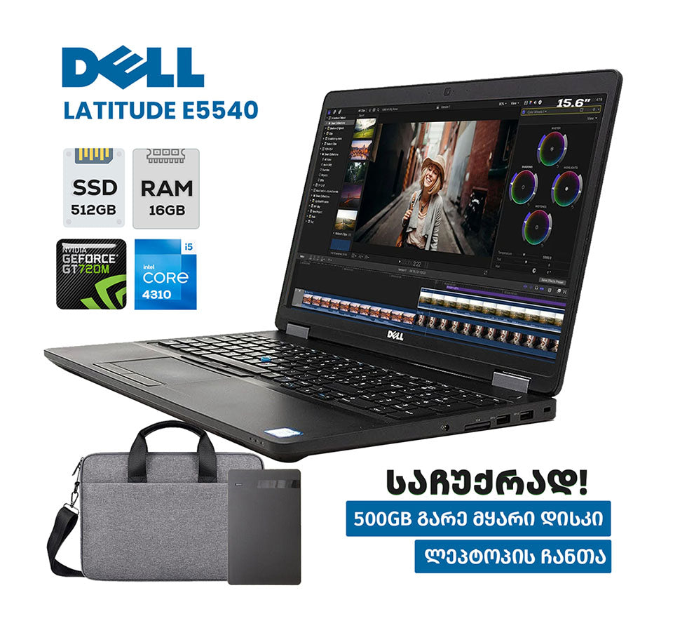 გრაფიკული დიზაინისთვის, ვიდეო მონტაჟისთვის/3D-ზე სამუშაოდ ან მსუბუქი თამაშებისთვის! ლეპტოპი Dell Latitude E5540, i5-4310U პროცესორით, 16GB მეხსიერებით და 512GB SSD მყარი დისკით. აქვს 15.6"-იანი HD ეკრანი. ლეპტოპს აქვს ინტეგრირებული და დისკრეტული ვიდეო პროცესორები (GeForce GT 720M 2GB). საუკეთესოა როგორც საქმისთვის ისე, გართობისთვის.