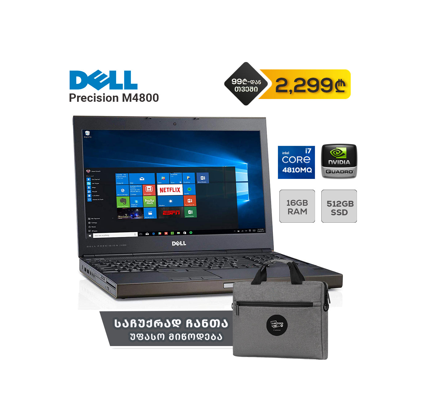 ძლიერი ლეპტოპი ვიდეო მონტაჟისთვის, გრაფიკული სამუშაოებისთვის და თამაშებისთვის. Dell-ის Workstation, Precision M4800 მე-4 თაობის 4 ბირთვიან / 8 არხიან i7-ის პროცესორზე, დისკრეტული ვიდეო დაფით NVIDIA Quadro K2100M, 2GB GDDR5 (ან AMD FirePro შესაბამისი მონაცემებით).