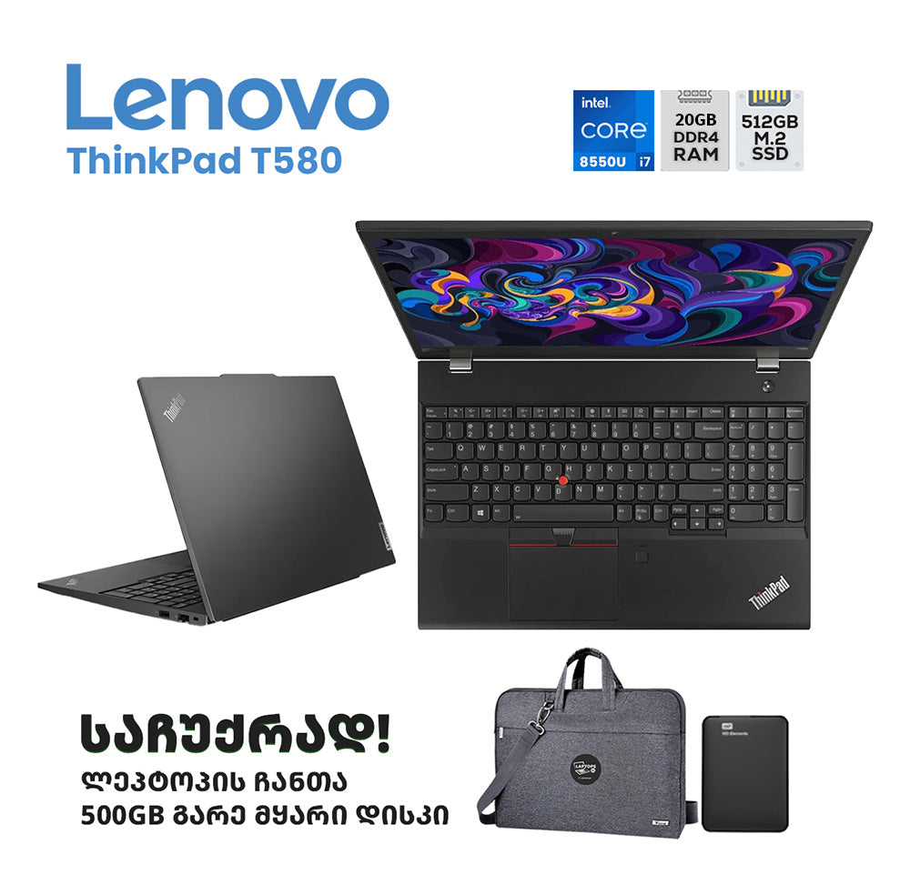 Lenovo-ს ძლიერი სამუშაო ბიზნეს ლეპტოპი ნებისმიერი სირთულის საქმისთვის. ThinkPad T580. აქვს 4/8 ბირთვიანი, მე-8 თაობის i7 პროცესორი i7-8550U, 20GB DDR4 მეხსიერება და 512GB M.2 SSD მყარი დისკი (შესაძლებელია გაზრდა). ეს მოდელი გახლავთ მაღალი ხარისხის 15.6"-იანი FHD ეკრანით. ლეპტოპი საუკეთესოა საოფისე საქმისთვის, პროგრამირებისთვის ან გრაფიკული დიზაინისთვის. ლეპტოპს მოყვება ლიცენზირებული Windows 11 Pro.