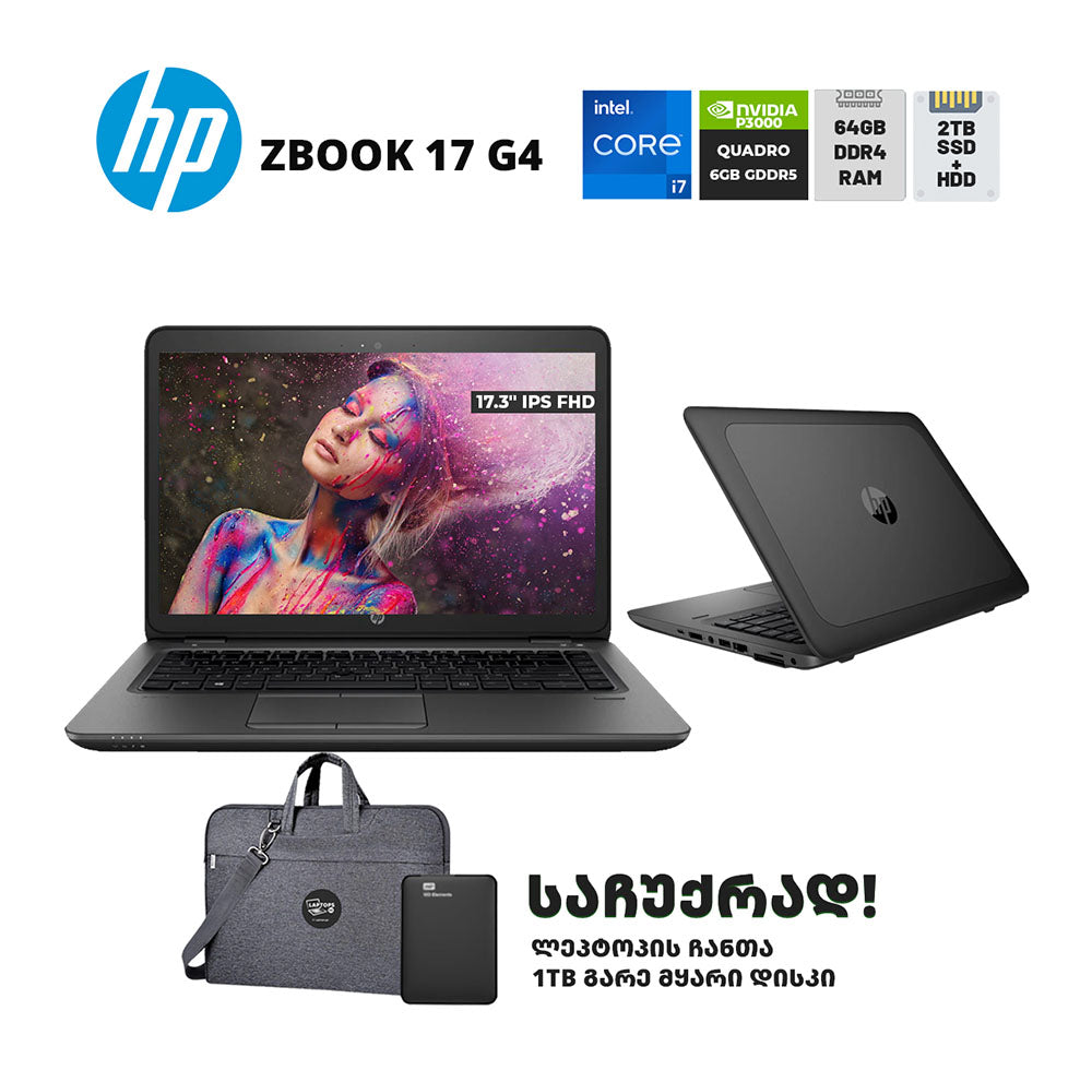 HP-ის ძლიერი სამუშაო ლეპტოპი (Mobile Workstation) ZBook 17 G4 განსაკუთრებული მონაცემებით! 17.3" Full HD IPS ეკრანით, 4 ბირთვიანი/8 არხიანი i7-7820HQ პროცესორით, 64GB DDR4 მეხსიერებით და 1TB M.2 SSD + 1TB HDD მყარი დისკით (სულ 2TB!). ლეპტოპი აღჭურვილია ვიდეო დაფით NVIDIA Quadro P3000 6GB GDDR5.